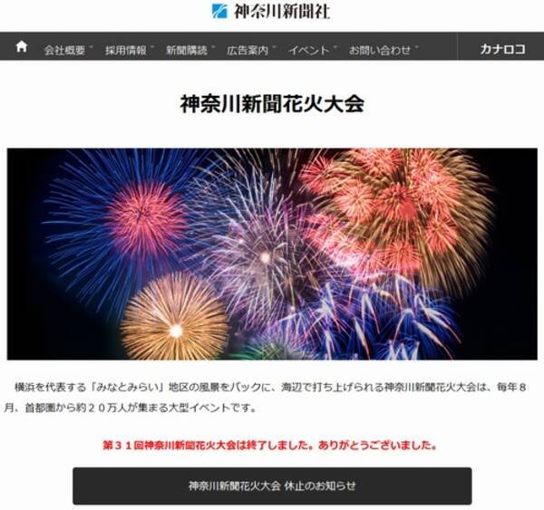 日本の花火大会一覧(にほんのはなびたいかいいちらん)は、日本全国で1 神奈川新聞花火大会( 横浜 市、8月第1火曜日、15,000発) 16年の開催をもって当分の間休止 。 宝塚観光花火大会( 宝塚市、8月第1土・日曜日、2日間延べ4,000発) 15年の開催をもって当分の間休止 。 無期限休止休館日のお知らせ 全室、源泉掛け流しの風呂付の客室となりました。 16年の花火期間中について 「究極の源泉宿73」のベスト10を選定 に掲載されました。 本日4月1日「究極の源泉宿73」祥伝社新書より発売! 著者:小森威川崎市制記念多摩川花火大会の様子など「思い出に残る花火・夏の写真」を、こちらで募集しております。もちろん他の花火や夏祭りの写真も可!たくさんの投稿お待ちしております! 写真を投稿する 最終更新日時: 関連情報 オススメ花火大会 横浜開港祭 Yokohama 18ward of